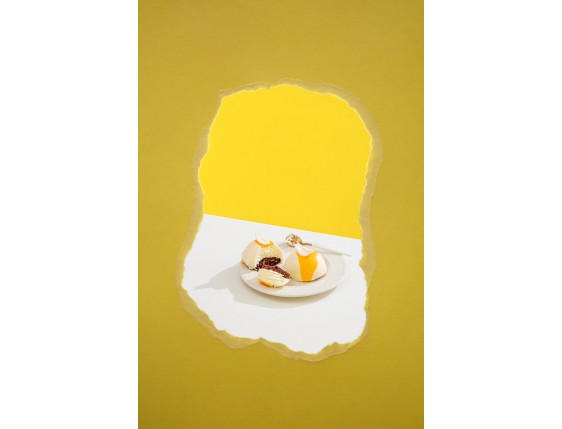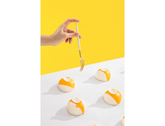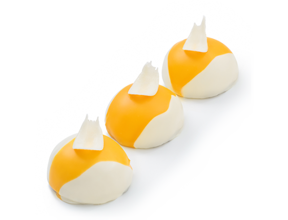 Lehké a neuvěřitelně jemné krémové suflé s přírodní broskvovou náplní a kousky vejce, položené na čokoládovém dortu.